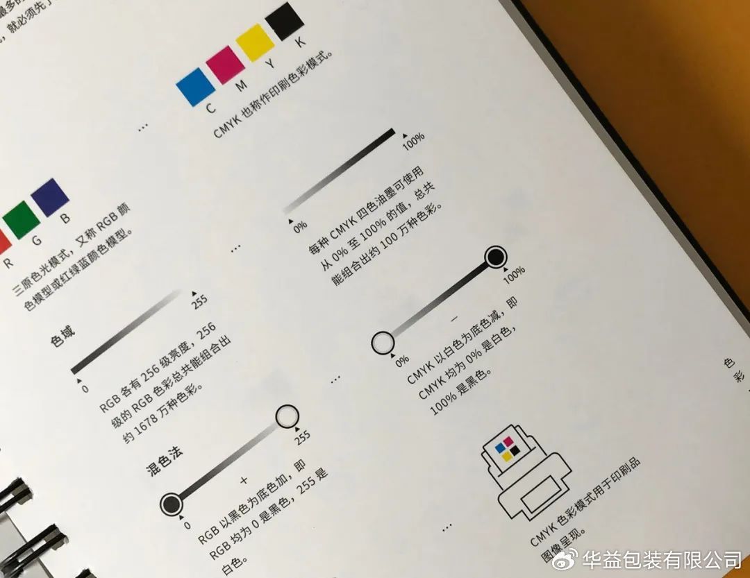 CMYK也称作印刷色彩模式,是由青、品、黄、黑四种颜色的油墨构成的,每一种油墨的使用量从0%到100%,由于CMY三种油墨在印刷中并不能形成纯正的黑色,因此需要单独的黑色油墨K,由此形成CMYK这种色料模式。油墨量越大,颜色越重、越暗;反之,油墨量越少,颜色越亮。CMYK均为0%是白色,100%是黑色。
