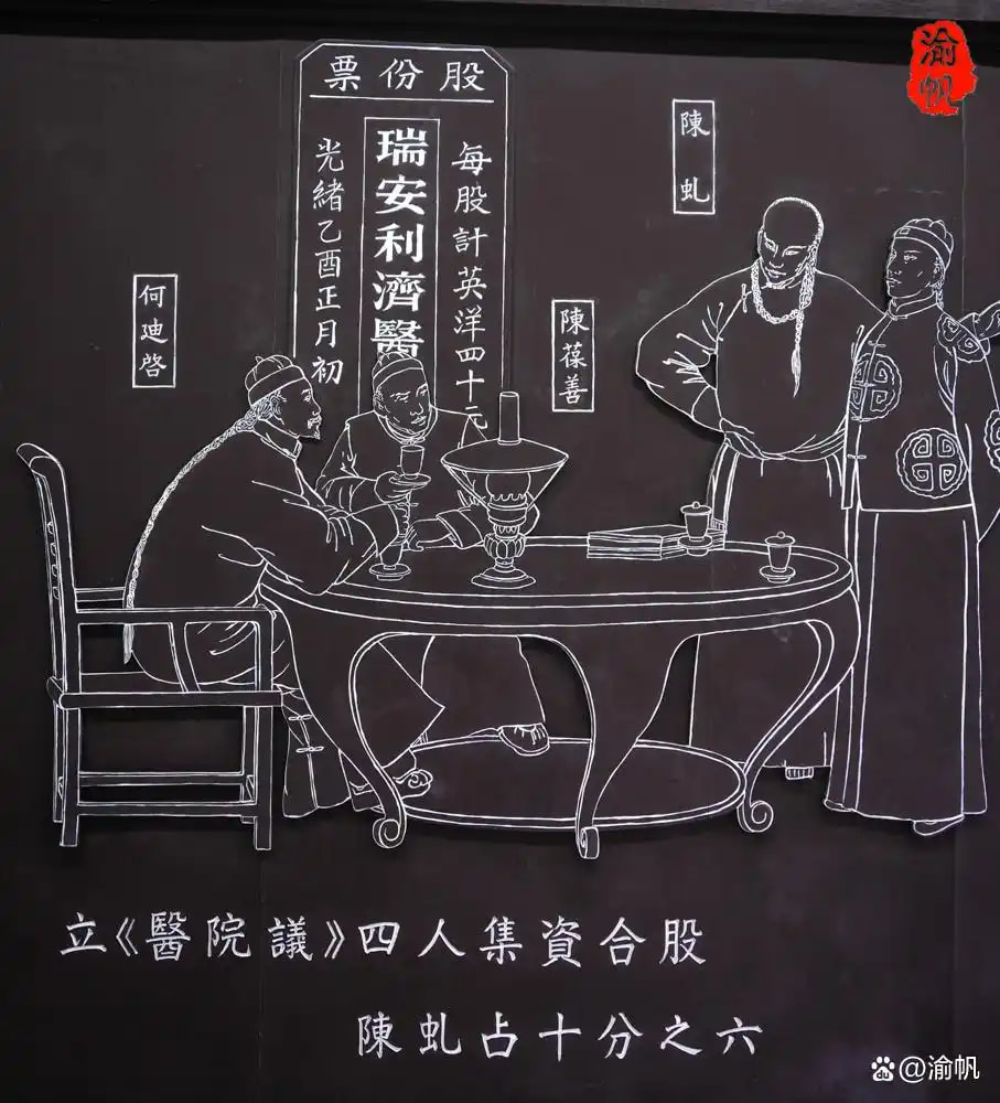 据相关资料介绍,利济医学堂创办于1885年,由陈虬等4人合股筹集资金,共10股,其中陈虬6股、何迪启2股、陈黻宸、陈葆善各1股。4人为董事,组成董事会,陈虬持大股,为董事长。董事会议决,各股东将来可以提取股息,但药房为共同所有,后世子孙不得视为祖业。以上订立合同,一式5份,除人手1份外,1份存档。这便是我国最早的股份制企业、服份制医学堂。
